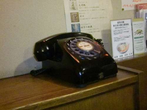 懐かしい“黒電話”があります、壁には1970年代~1980年代のアイドルの寫真やレコードが飾られています