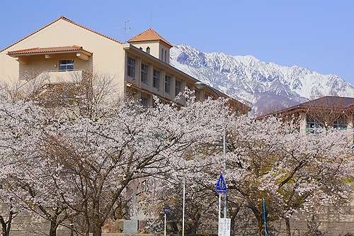 正門前、高臺のポイントより學校を望めば手前に桜、奧に大山というロケーションでの春模様が楽しめます。