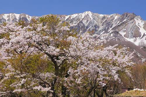 圧倒的な大山の南壁の手前、一面の平原の上に立つ桜との競演は4月末が見ごろ。