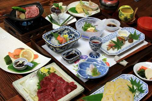 熊本特産の馬刺や阿蘇の赤牛をはじめ、山の美味を中心とする數々の料理。