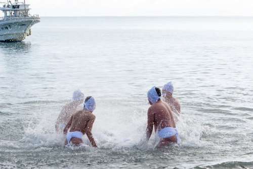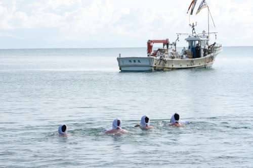 海上では漁船たちが、浜辺では関係者と大勢の観客が見守る中、勢いよく海に突進していく若者たち。