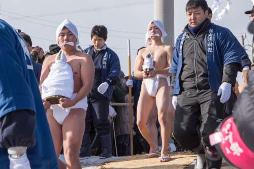 このお祭りは、神社にある4つのご神體を4人の男子が1柱ずつ抱え、海に飛び込んでご神體を清めるというもの。海での沐浴をする前の2日間は神社にこもり、晝夜を問わず水ごりをして心身を清めます。