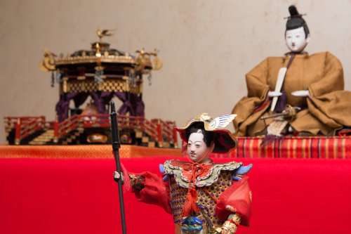このおひな様が少し変わっているのは、2段目にいる3人が一般的なおひな様のどれにも當てはまらないこと。3人のうち2人は女性ですが、三人官女とは衣裝も持ち物も異なります。また殘る1人は男性ですが、日本的ではないよろいを身に著けていて、なんだか不思議。右大臣?左大臣とも少し違います。このひな人形、今は同ホテルが持ち主から譲り受けて毎年飾っているとのことです。