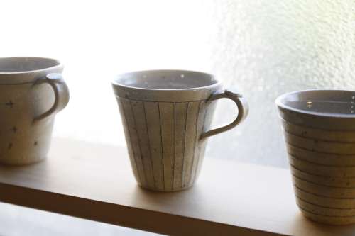 溫かい印象の池田さんの作品。マグカップや豆皿、小鉢などが揃います