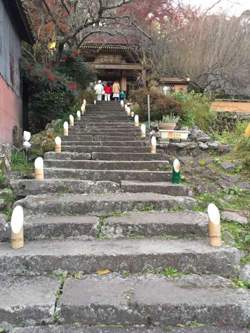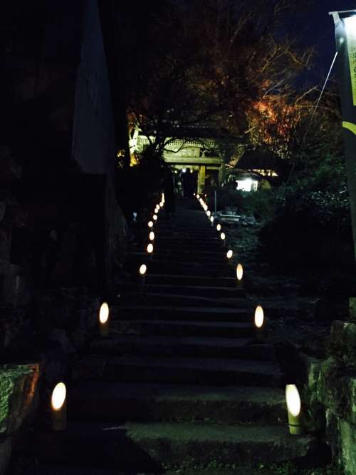 行くときには明るかった階段が、帰りには竹燈篭でライトップ されています。