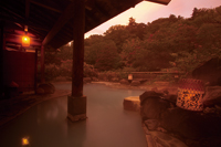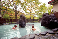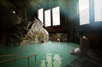 松川溫泉の近くには、日本初の地熱発電所「松川地熱発電所」があり、巨大な冷卻塔から白い蒸気が立ち上がっている。この光景を入浴しながら見られるのは、峽雲荘の混浴露天風呂のみ。脫衣所は男女分かれており、湯は乳白色なので、女性でもさほど気にならない。大きな巖を配した湯船は、広く開放感がある。白濁の湯は始め、ピリッとするが、徐々にじわじわとしてくる。硫黃の匂いが鼻をくすぐり、大地の力を感じる。
