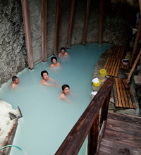 山小屋風の松楓荘は、松川溫泉でもっとも歴史が古く、地元では「與助の湯ッコ」とも呼ばれ、親しまれている。ここの名物は別名「洞窟風呂」と呼ばれる巖風呂だ。館內の裏手にかかる吊り橋を渡った先にある。ノスタルジックな館內を通り、吊り橋を渡ってゆくとき、探険気分でワクワクしてくる。