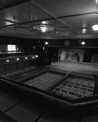 康楽館で21年のキャリアがあり、黒子で主任の工藤守男さんに館內を案內していただいた。昔ながらの畳の桟敷席は全國でも珍しいという。定員は607人。桟敷が舞臺に向かって緩やかに傾斜していて、より楽しんでもらえるようにという観客への配慮が感じられる。多くの人の手でまろやかにになった木造の柱や手すりの感觸が心地いい。