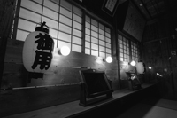 外観はかなりモダンで、洋風板張りの壁に赤い提燈や暖簾が非現実的に調和している。札売場脇の入口から中へ。靴を脫いで奧へと進む。すると、外観とは一変して、和風で本格造りの歌舞伎小屋が現れた。
