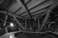 舞臺の地下へと階段を降りると、あるのは「奈落」。ひんやりと涼しいここでは、4人で動かす回り舞臺のろくろ仕掛けや、花道へ役者を迫り上げる「切穴(すっぽん)」の仕掛けを見ることができる。実際、このように人力で行っている小屋はいまでは無くなってしまったらしい。康楽館には現在9名の黒子がおり、それは全國的に見ても"多い"のだという。日本最古の現役木造芝居小屋の底力を見た気がした。