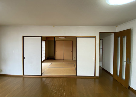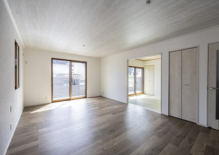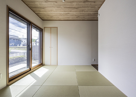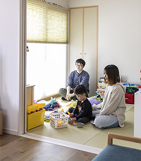 リビング橫の和室は琉球畳に張り替えたことで、洋風(fēng)のリビング?ダイニングとも調(diào)和するモダンな雰囲気になりました。塗り壁風(fēng)のアクセントクロスがポイントです。現(xiàn)在はお子さまのプレイルームとして活用されています。