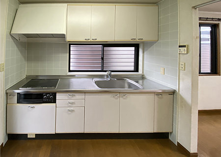 袖壁を撤去してカウンターを設(shè)け、リビング?ダイニングとの一體感を高めています。設(shè)備も一新され、吊り戸棚やシンク下収納は床や天井材に合わせた木目調(diào)の化粧板を採(cǎi)用。