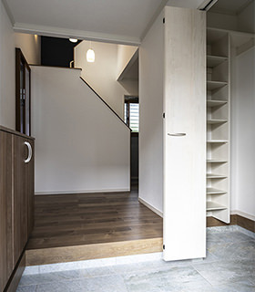 玄関ドアは斷熱性の高いものに入れ替えました。玄関ホールは土間スペースを拡張して約1帖のシューズクロークを設(shè)置。夫のDさまの趣味の釣り道具や、お子さまの三輪車(chē)などを収納する場(chǎng)所としても重寶しているのだとか。