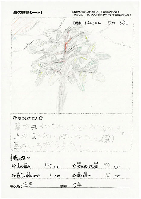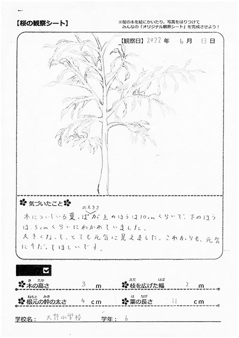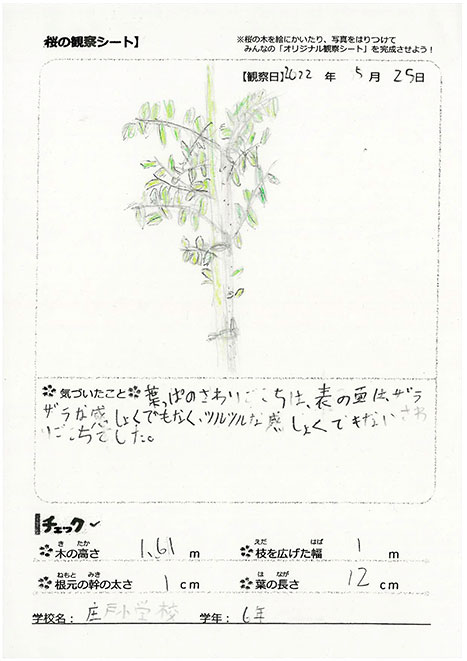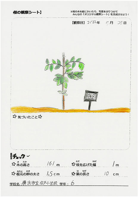 莊戸小學校は、太鼓クラブのみんなの演奏がとっても素敵だったのを覚えているわ。苗木は緑の葉っぱをつけて元気に育っているようね。これからもっと大きく成長していくのが楽しみね!一緒に桜を見守っていきましょう!(おはな)
