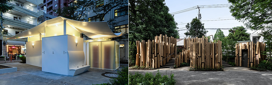 (寫真右)「緑豊かな松濤公園に、集落のような、トイレの村をデザインした」という隈研吾氏による鍋島松濤公園トイレの外観。寫真:株式會社エスエス
