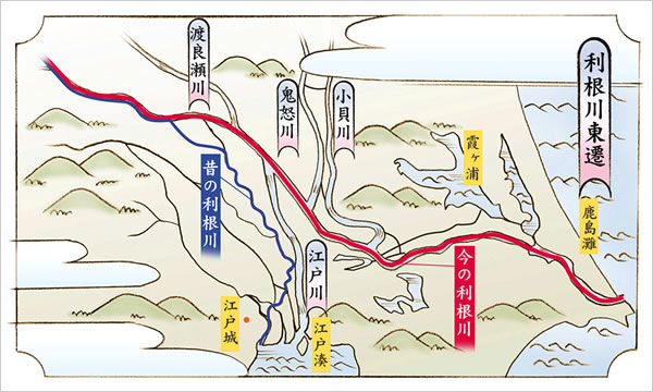 當時江戸湊に注いでいた利根川を渡良瀬川へと合流させる工事を行い、鹿島灘へ注ぐ流れに変更した。事業が完成するまで、家康が任命した土木官僚、伊奈家は3代に渡り関わった。