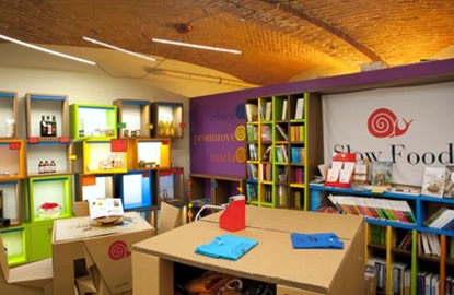 街には、スローフード協會直営の書店もあり、スローフードの背景を知りたい人たちが足を運ぶ。