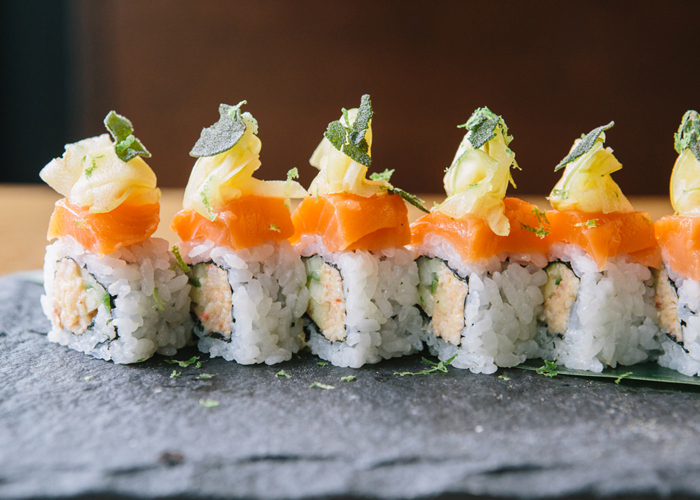 アラスカ産ギンザケをのせた「キモノロール」。