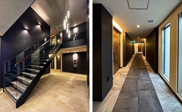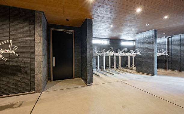 エントランスを入ると、タイル貼りの壁が外から中へと続き、共用部へ誘われるデザインに。屋內廊下には自然光が入るよう窓を設けたほか照明計畫にも配慮し、晝間はやわらかな明るさを、夜はやすらいだ雰囲気を感じられる空間にしました。屋內に設けた駐輪場は出入口が自動ドアで、ベビーカーや子ども用の自転車が置けるファミリースペースも用意しています。