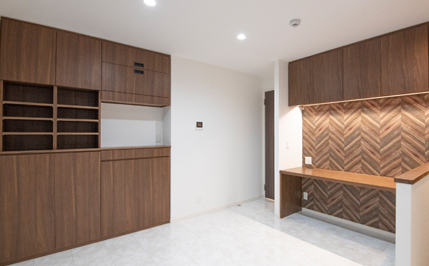 また1階には、Iさま専用のオーナールームを設置。內裝には特殊なデザインや仕様を各所に盛り込んだほか、可変できるオーダーメイド家具も取り付けました。