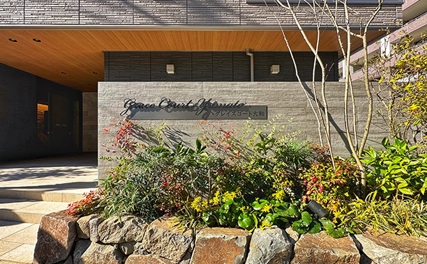 エントランスアプローチの植栽と生垣は建物に彩りを與えます。