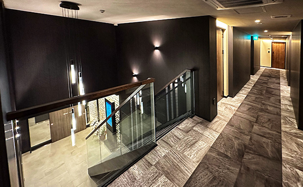 屋內廊下は間接照明を配しつつ自然光も取り入れて和らいだ雰囲気に