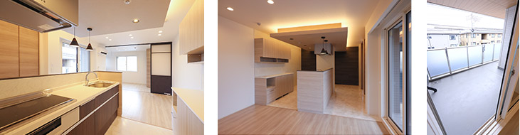 広々としたオール電化仕様のキッチンには、前後に十分な収納スペースを確保し、折り上げ天井と呼ばれる間接照明を活かした、住む人にやすらぎを與える設計となっています。