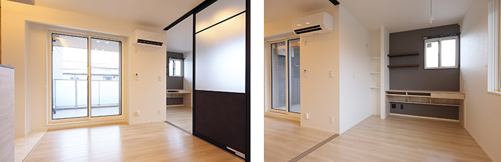 リビングには、すりガラスのスライドドアが設置され、二つの部屋に仕切って使用することも、解放すれば広いリビングルームとしても活用可能です。個室にもなる洋室の奧には、リモートワークにも使えるデスクが備えられています。