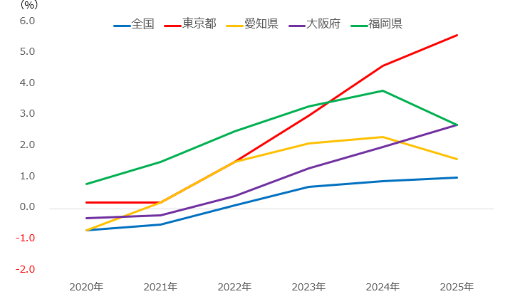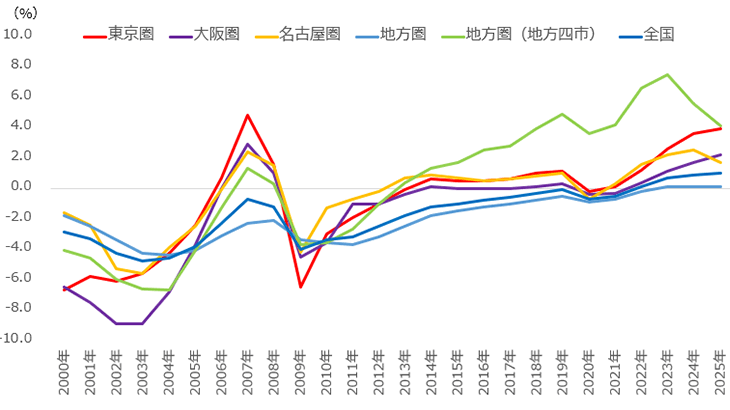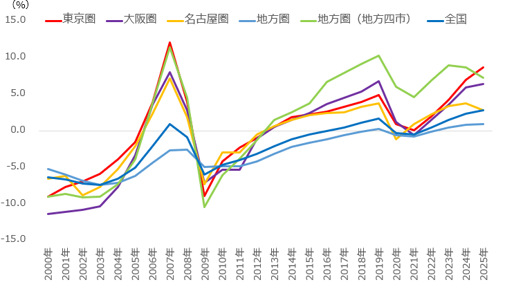 その一方で、地方四市を除く、「その他地方圏」では、±0.0%となり、30年ぶりにマイナス圏を脫しました。ちなみに、過去5年をみれば、2024年は-0.1%、2023年は-0.2%、2022年は-0.5%、2021年は-0.8%で順調に回復した足取りが伺えます。