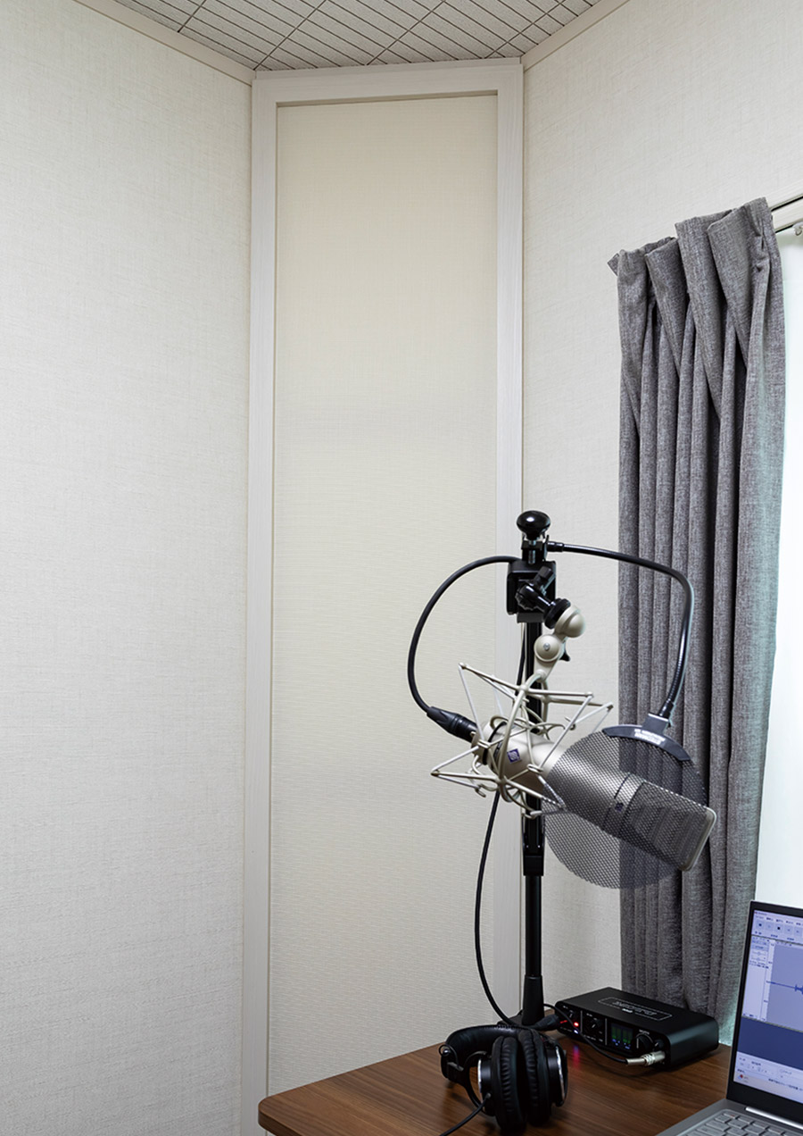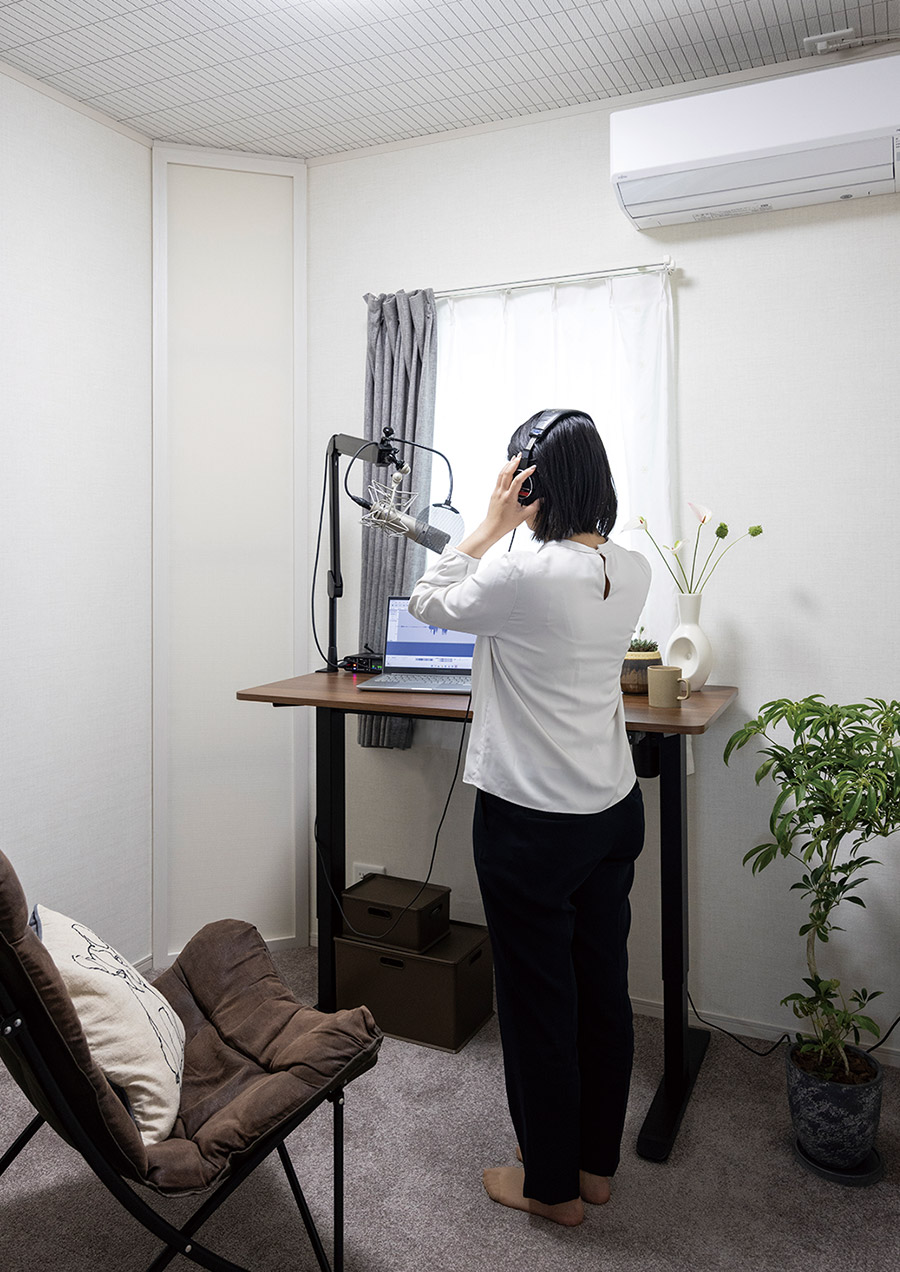 妻のMさんが「前々から憧れていた」と話す、大和ハウスの快適防音室「奏でる家」。聲を使った趣味をお持ちで、舊居では置き型の防音ルームを使用されていたMさんは、今回念願の防音室を実現されました。「予想よりも費用が抑えられたので、思い切ってハイグレード防音にグレードアップしました。空間が広く、窓から外の景色も見え、とても居心地がいいです」と笑顔を見せます。専用機材を備えたMさんだけのスタジオで、気兼ねなく趣味の時間を満喫しておられるようです。