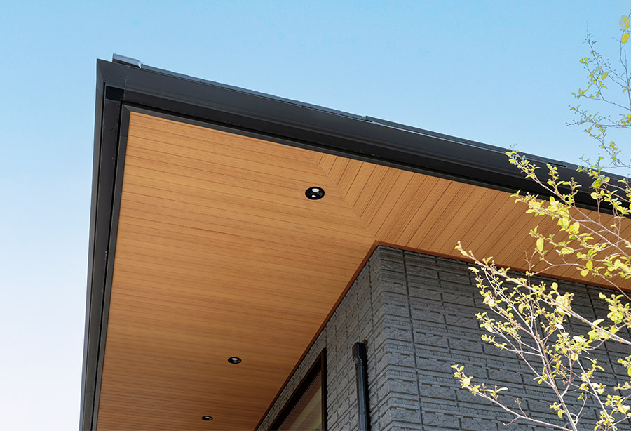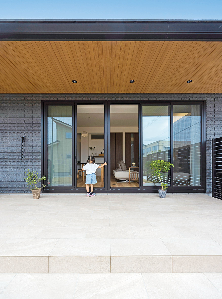 外とつながるタイルデッキは、夫のTさんからのリクエストです。バーベキューをしたり、レジャーシートを敷いてピクニック気分を味わったりするのにぴったりだそう。大屋根が生む深い軒下空間が、日差しや雨をやさしく遮りながら、ご家族の団らんを豊かに演出します。