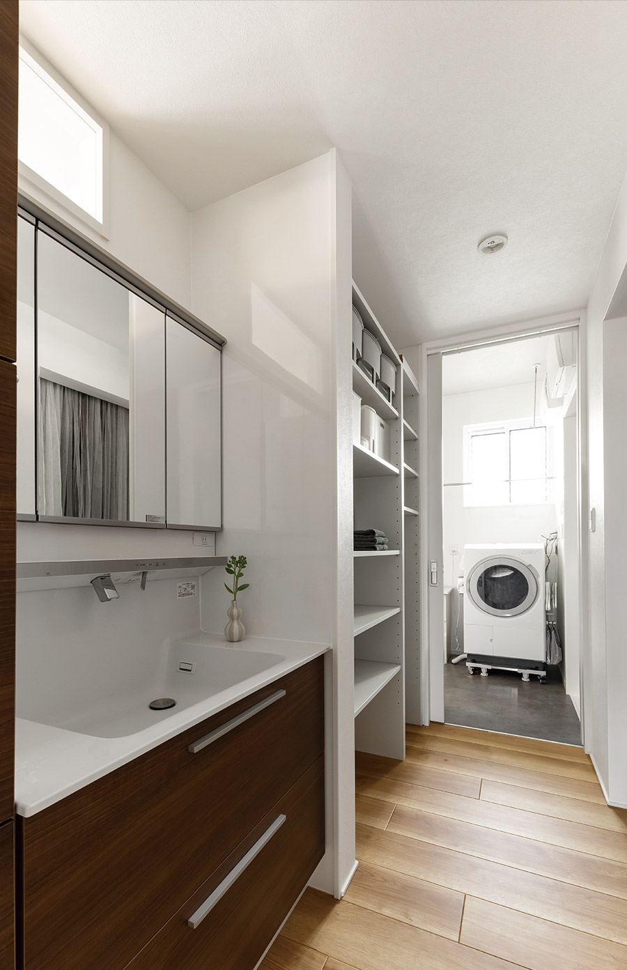 共働きのご夫妻は、家事動線にも強いこだわりをお持ちでした。そこで、住まいの中心に洗面室を配置し、LDK?脫衣室?玄関ホールとつながる回遊動線を確保することで、どの空間からもアクセスしやすい間取りに。洗面室の隣にはファミリークローゼットを設け、水回りと収納を一か所にまとめました。「暮らしが整って、家事の時間がぐんと短くなりました」とご夫妻。長女のCちゃん(4歳)も、朝の身支度や帰宅後の片付けを自分でできるようになったそうです。