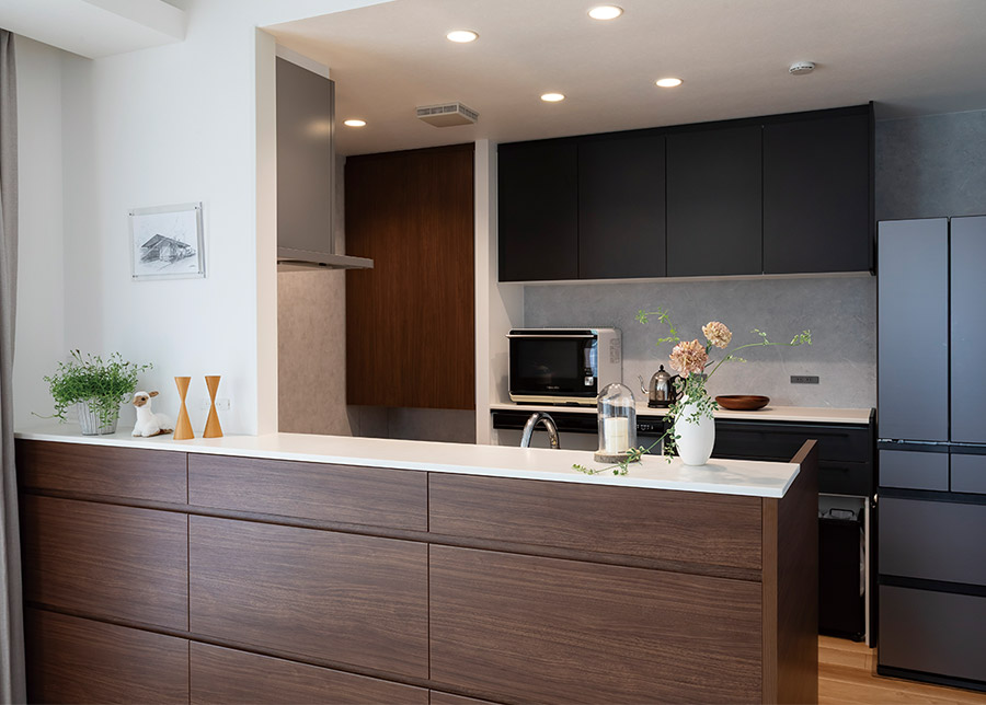 すっきり片付いた狀態を保つため、収納力のあるスマートビューカウンターを採用。「引き出しタイプで內部を無駄なく使えて、出し入れも楽です」とTさん