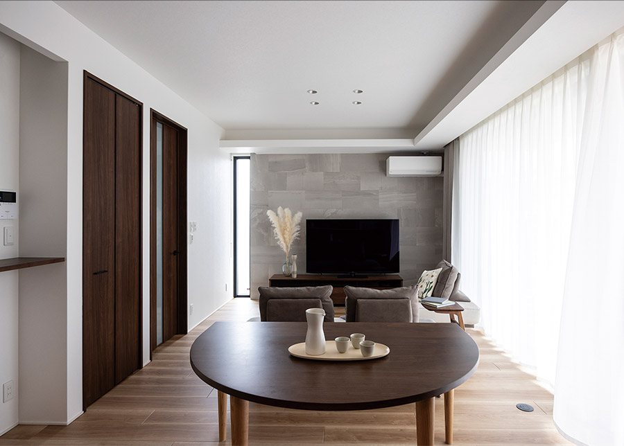 自然光が空間をやさしく包む、Kさまご一家の暮らしのメインステージ。白とブラウンでまとめたナチュラルなデザインです