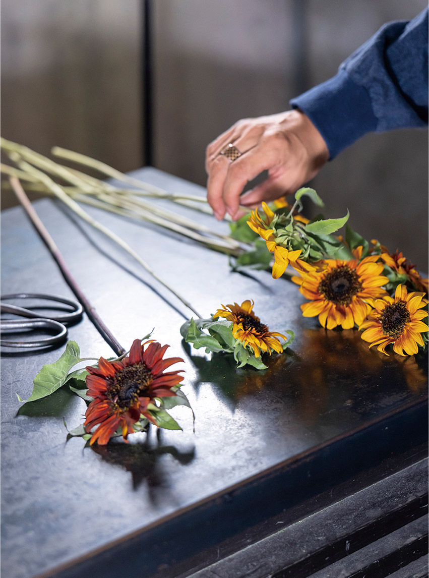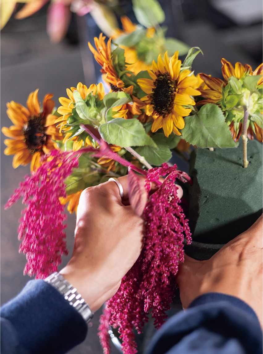 取材時に作っていただいた作品は、「ダージリン」という珍しい種類のヒマワリとアマランサス(紐ケイトウ)の2種類を使ったアレンジです。少ない花種でデザインを作るのは、一輪の花に深く向き合うことができるから。「例えばヒマワリを30本使えば、1つの器の中に30通りの表情を出せます。そうすることで、多くの花種を使ったアレンジからは生まれない造形を生み出せるのです」
