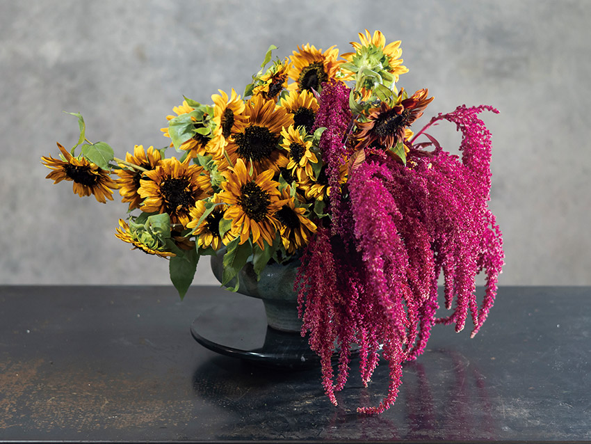完成したヒマワリとアマランサスのアレンジは、奧行きのある仕上がりに