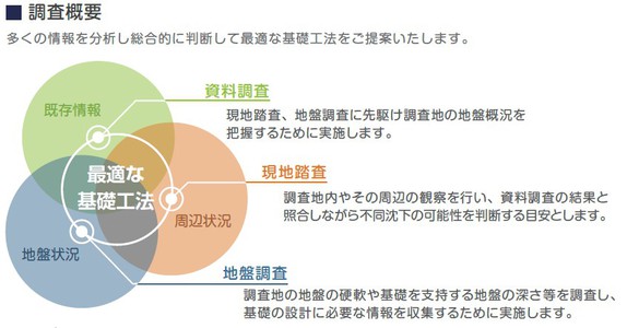 「資料調査」や「現地踏査」の結果を踏まえ、「地盤調査」で実際に地盤の狀態を確認することで、多くの情報を総合的に判斷して最適な基礎工法をご提案できるようになります。たとえ地盤調査の結果が同じでも、「資料調査」と「現地踏査」の狀況によっては、異なる判斷が必要になるため、「資料調査」や「現地踏査」は非常に重要だと言えます。