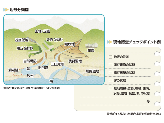 まず、「資料調査」は、地形図、土地條件図、舊版地形図、過去の地盤調査資料や施工実績など地盤の情報を収集して、地域的な地盤の良し悪しを判斷します。例えば、計畫敷地が以前田んぼだった場合や、地形が谷底低地や舊河道に分類される場合は、有機物を含む弱い地層が堆積していることが考えられます。逆に、古くからの集落があった場所や、土地條件図で臺地?段丘に分類される場所などは、良好な地盤であることが期待できます。