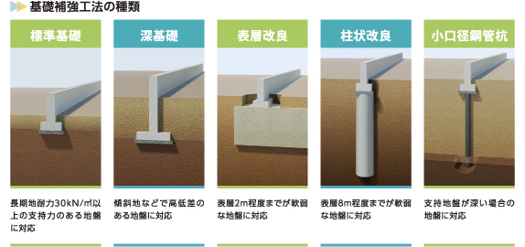 軟弱層が堆積し、直接基礎を採用できない場合は、地盤改良や補強が必要になります。表層2m程度の地盤が軟弱な場合は、セメントと土を混ぜて固化させる「表層改良」を実施。軟弱層がさらに深い場合は、「柱狀改良」や「小口徑鋼管杭」で地盤補強を施します。「柱狀改良」は地中に柱狀の改良體を作り建物を支えるもの。「小口徑鋼管杭」は支持層が深い場合に対応する工法です。下図の右に行くほど深くまで補強することが可能となり、より安全性が高まる反面、補強費用が高くなるため、安全性と経済性のバランスも考慮して判斷していく必要があります。
