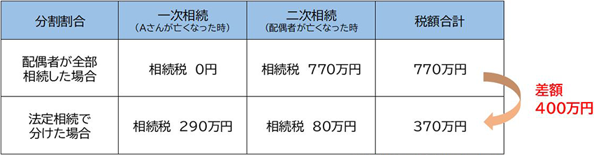 Aさんが一次相続で相続稅を0円にしようと、全ての財産を配偶者に相続したため、二次相続では合計770萬円の相続稅がかかってしまったのに対して、法定相続で分けた場合であれば、一次相続時に合計290萬円、二次相続時には合計80萬円となり、合わせて370萬円の相続稅で済むことになります。