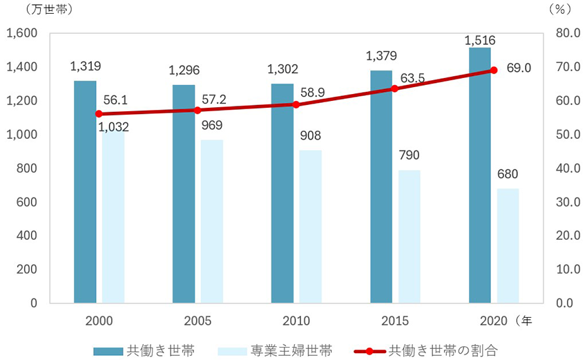 內閣府の資料によると、2000年には約56%であった共働き世帯の割合が、2020年には約70%にまで増加しています。夫婦ともに収入があることから、住宅購入においても世帯収入を前提に考えるケースが一般化しています。