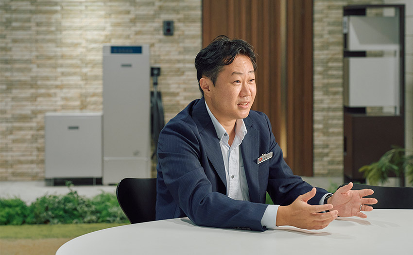 太田:晝間に電気自動車が家に置いてある日は、太陽光発電の余剰電力を蓄電池と電気自動車へ同時充電。夜間は、晝間にためた蓄電池や電気自動車から家へ放電して使うのがおすすめです。技術的な話になりますが、一般的な充電器は太陽光発電の電気を直流から交流へ変換する際にロスが発生します。しかし、大和ハウスが採用するV2Hは太陽光発電由來の電気を直流のまま充電できるため変換ロスがなく、クリーンな電力を最大限活用することができます。