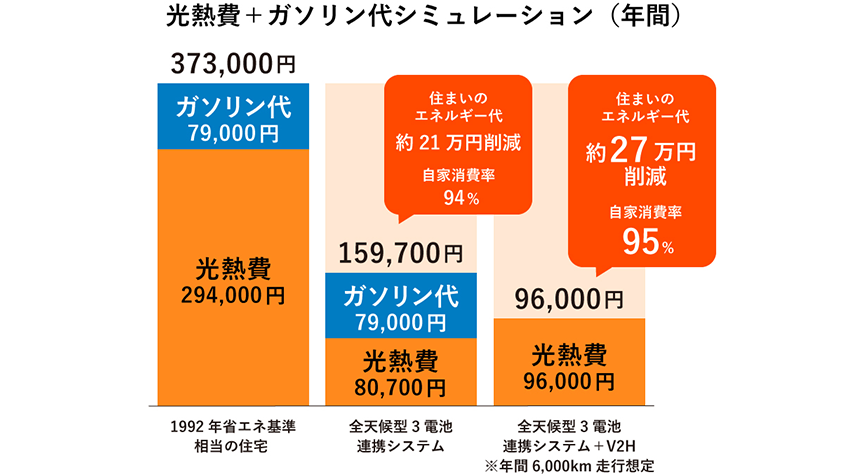 例えばシミュレーションでは電気、ガス、ガソリンのトータル費用は1992年省エネ基準相當の住宅よりも年間約27萬円※1の削減が見込め、「全天候型3電池連攜システム」のみを導入した場合と比べても、年間約6.3萬円※1も安くなります。