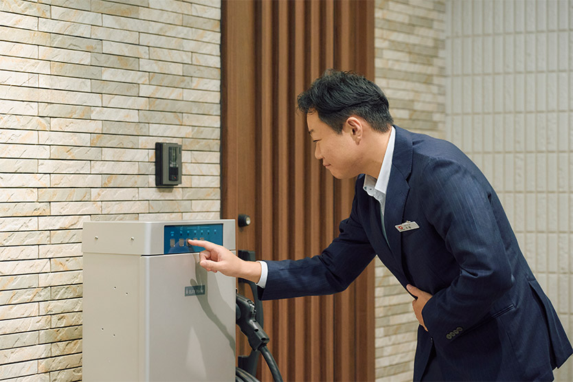 充電はとても手軽で、V2Hスタンドのケーブルを電気自動車の急速充電口にカチッと接続するだけ。災害時のレジリエンス※5を考えれば、電気自動車の充電は常にフル充電にしておくのが好ましいので、車で帰宅したら充電するのを習慣にするといいですね。従來の電気自動車の充電設備は、空の狀態からフル充電まで約16時間かかりますが、V2Hならその半分の8時間で充電が可能です※6。