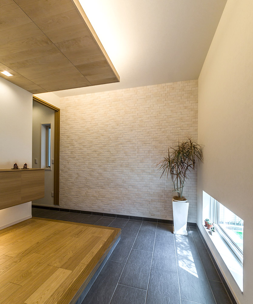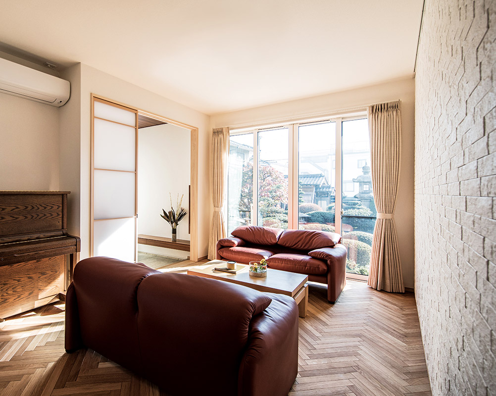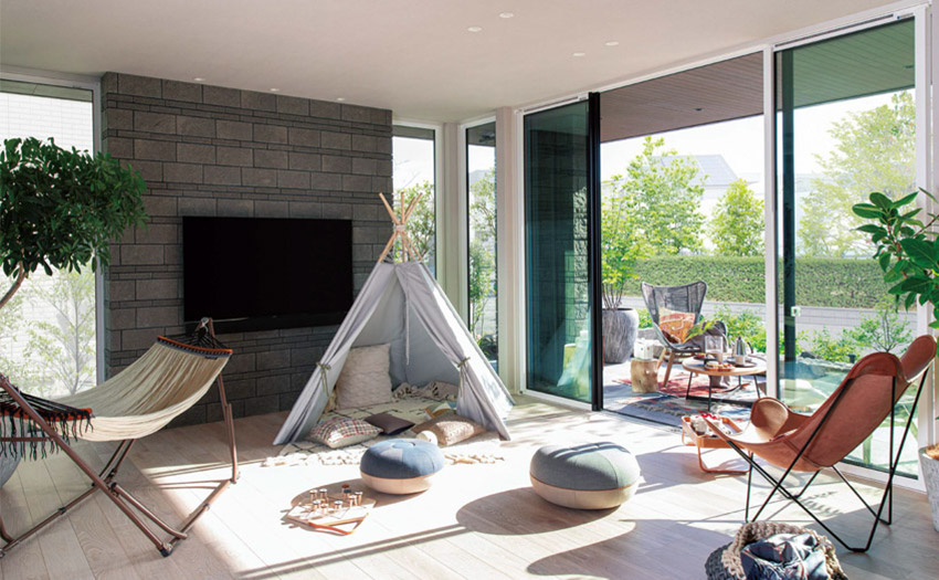 室內と室外の素材を合わせると、家全體に統一感が表現できます。テラスへとフラットに続くオープンなリビングには、その間取りをさらに引き立てるため、外の柱に使用している外壁用タイルをアクセント壁にも使用。內と外がつながり、開放感ある空間に仕上がります。