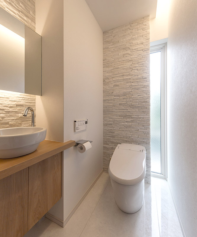 調濕機能のある素材(エコカラットや漆喰、珪藻土)などもアクセント壁に使用できます。広い部屋で効果を実感するには、相応の面積に張る必要があり、コストもかかります。小さい面積でも効果を実感しやすいのは洗面室やトイレや玄関などのスペースです。消臭効果も期待できるので、ペットがいるご家庭にもおすすめです。