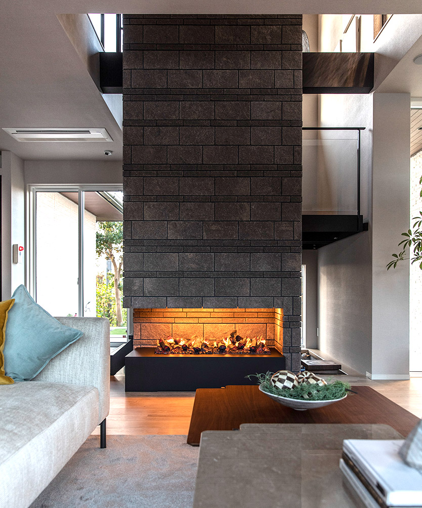 リビングの暖爐など、他に目立たせたいフォーカルポイントがある場合は、大判のタイルなどを採用するのがおすすめです。素材感がありながらも主張しすぎないので、メインとなる暖爐を引き立ててくれます。