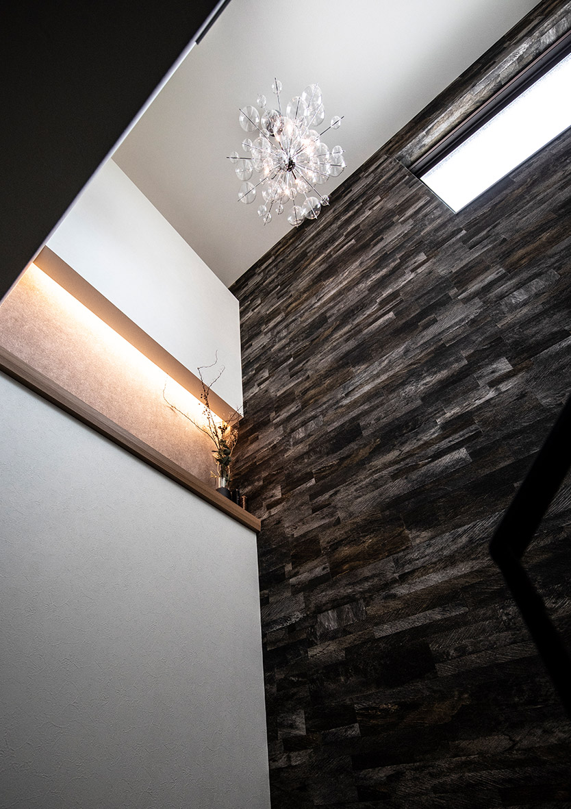 素材感のあるアクセント壁は、照明の當て方を工夫すると、光と影により立體感が出て、晝と夜で異なる雰囲気が生まれます。部屋の全體照明との組み合わせもポイント。また赤味のあるレッドシダーの壁には、少しオレンジがかった間接照明を當てるなど、素材と照明の色の系統を合わせると空間がまとまります。