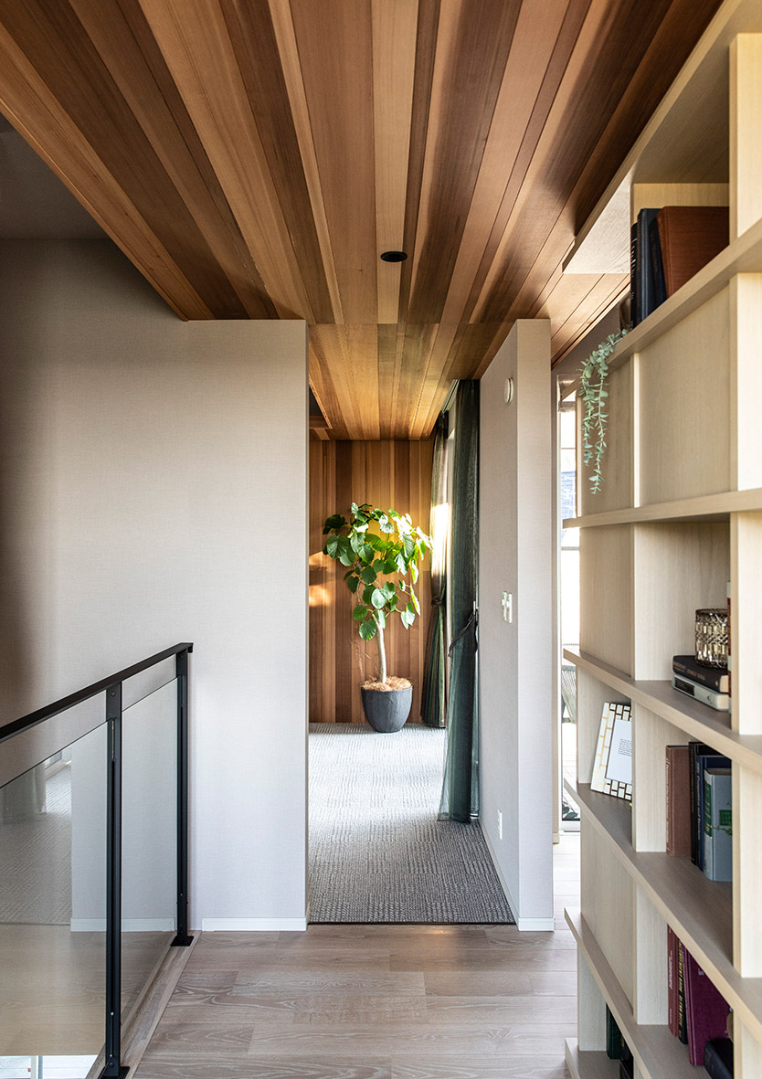 廊下から続く天井の木目が、寢室へと視線を誘います