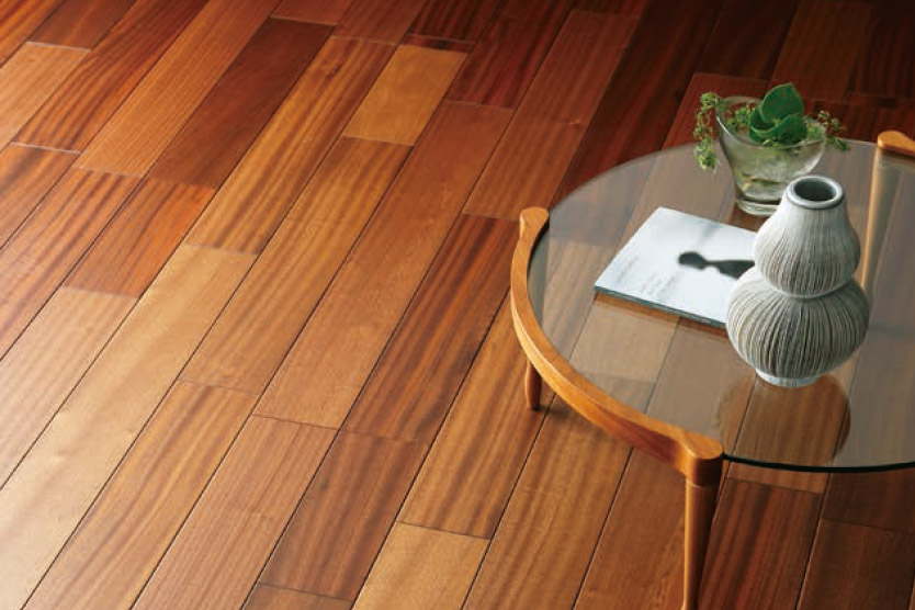 カバの無垢フローリング。広葉樹獨特の緻密な木肌の美しさが際立ちます。